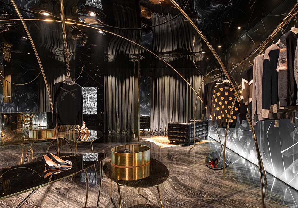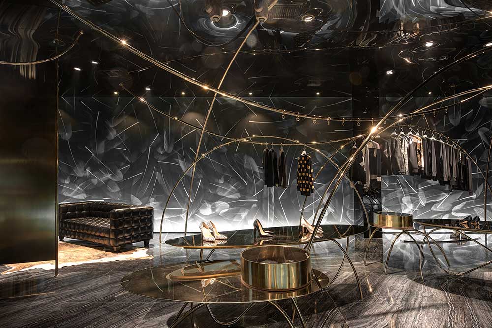 海淘如鴻雁傳書,聯(lián)想到鳥,于是便將主題定為飛翔的軌跡。曲線是四面而來的,無定向串聯(lián)起懸掛其中的服飾。燈光是運(yùn)動(dòng)的,在服裝上騰挪,形成動(dòng)態(tài)的耀眼光斑。我們將雕塑藝術(shù)引入道具設(shè)計(jì),讓所謂潮流不停流于表像層面。流行也好,時(shí)尚也罷,并無定勢(shì)如曇花一現(xiàn)。單純從三維考慮空間,難免被禁錮,這一次,我們嘗試用靜態(tài)詮釋動(dòng)態(tài),若深層解讀,記錄的是時(shí)間。