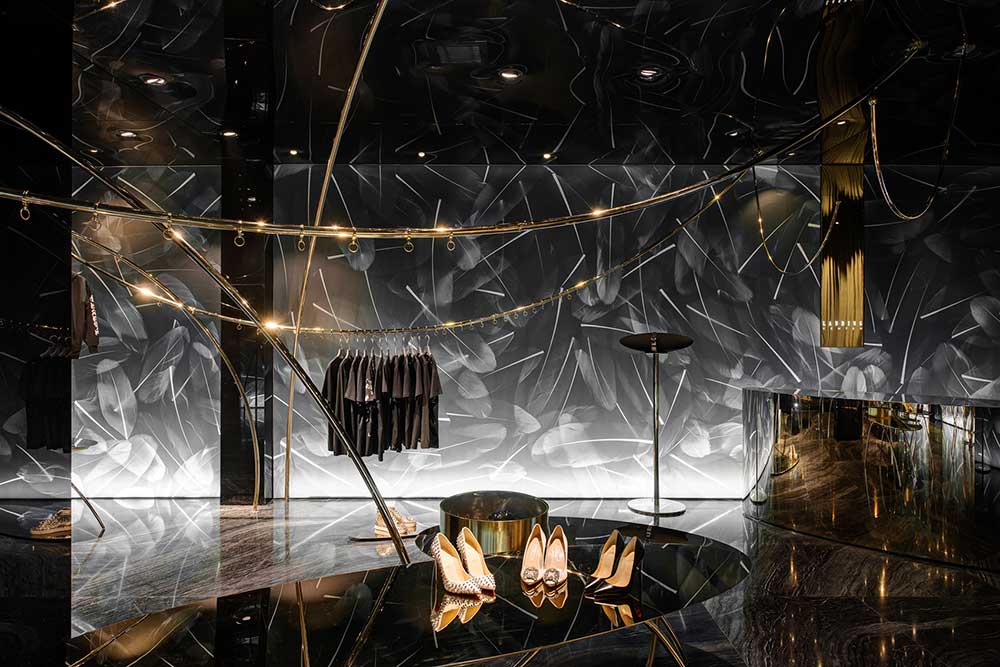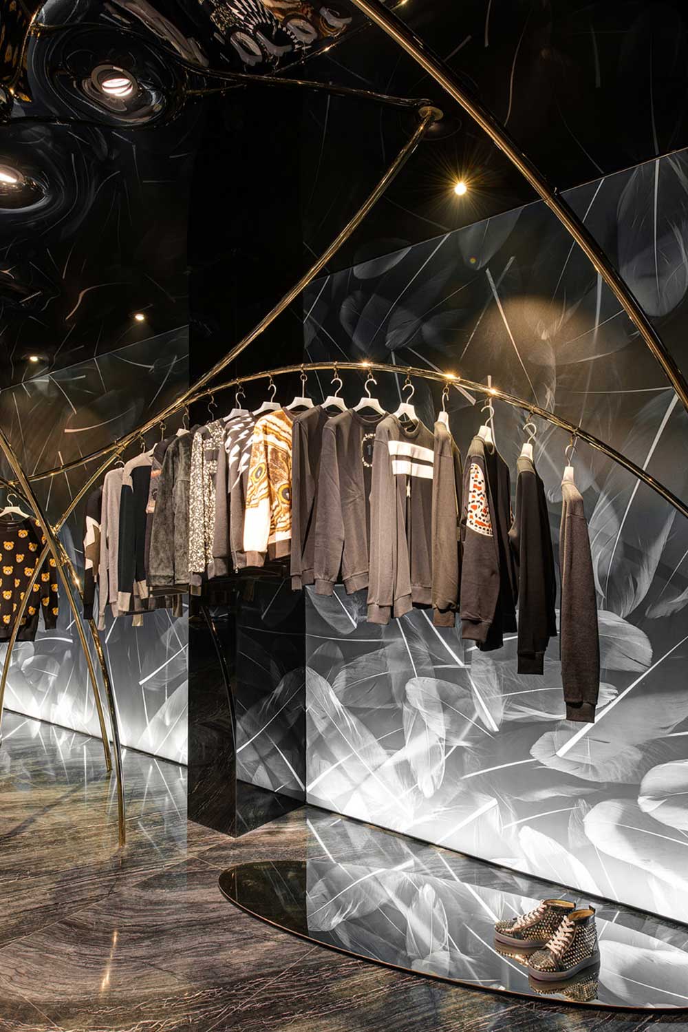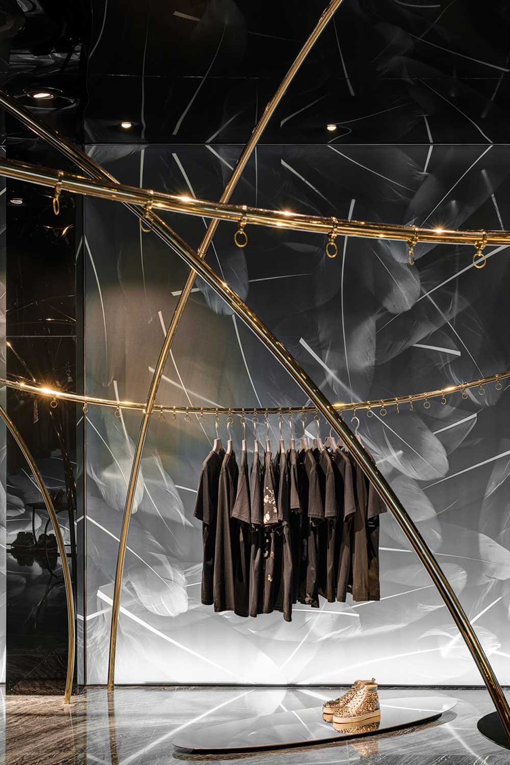 材料并非手段,可理解為達(dá)成的通道。商業(yè)攝影的介入讓羽毛圖形得以在透光軟膜上漾開,配合暗藏的燈光,制造引力反轉(zhuǎn)效果;兩種規(guī)格香檳金的鐵管,一為起點(diǎn)一為終點(diǎn),如白描的線條在空中隨性;黑色鏡面軟膜天花產(chǎn)生的屈光效果,把空間里的物品鏡化出了水墨畫的感覺。西方材料的東方表達(dá),是本案在材料運(yùn)用的主張。