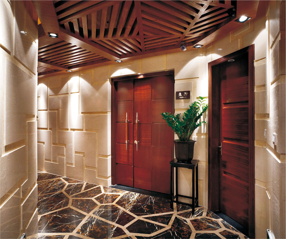 設(shè)計(jì)說明:設(shè)計(jì)手法上運(yùn)用豐富的材料,以深色石材,自然木材,混凝土飾面,磚的立體形態(tài)等等,結(jié)合東方元素圖案進(jìn)行設(shè)計(jì),各種材料的質(zhì)感在照明設(shè)計(jì)的引導(dǎo)下發(fā)揮出最優(yōu)效果,裝飾燈具的搭配令空間更加豐富、更加引人注目,給人明亮開揚(yáng)的視覺感受。